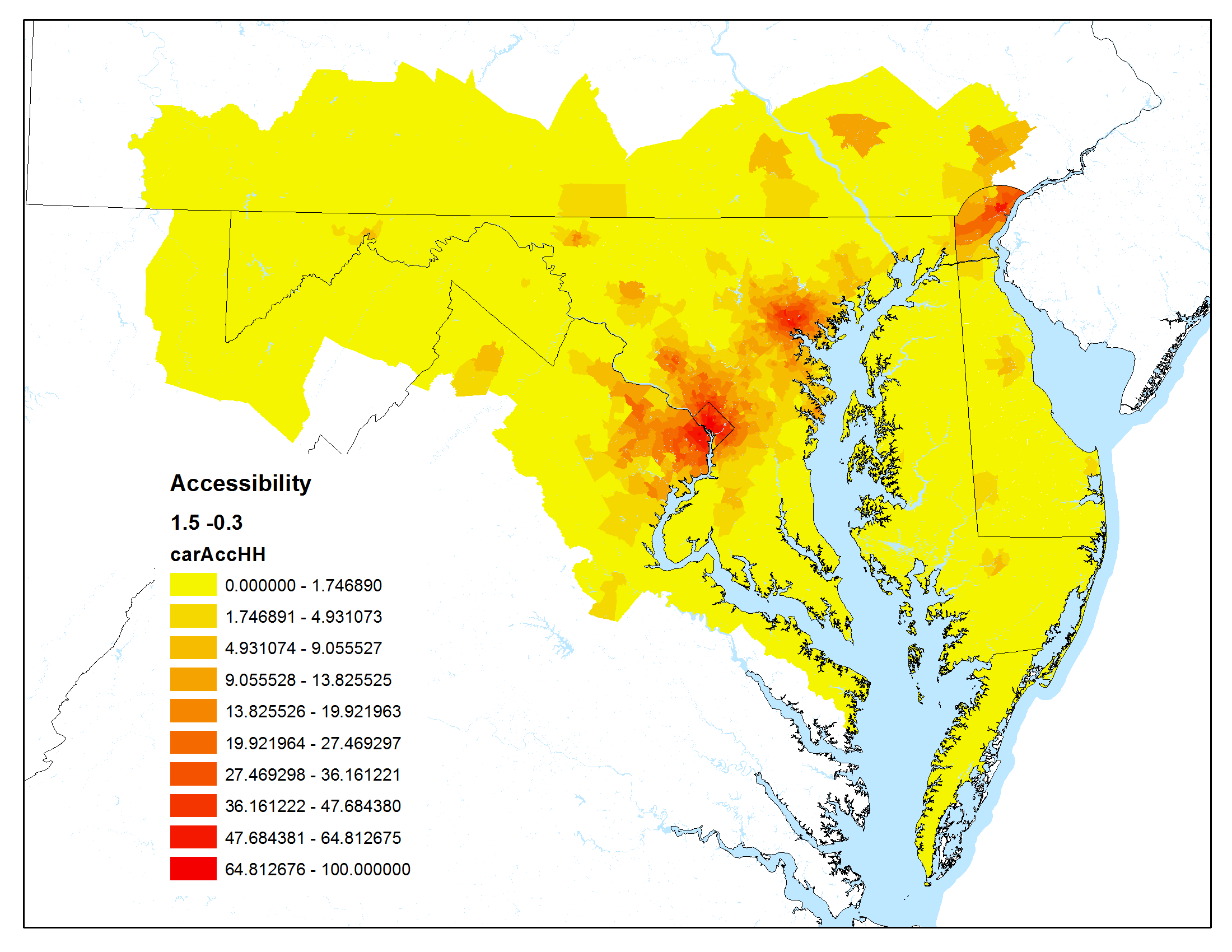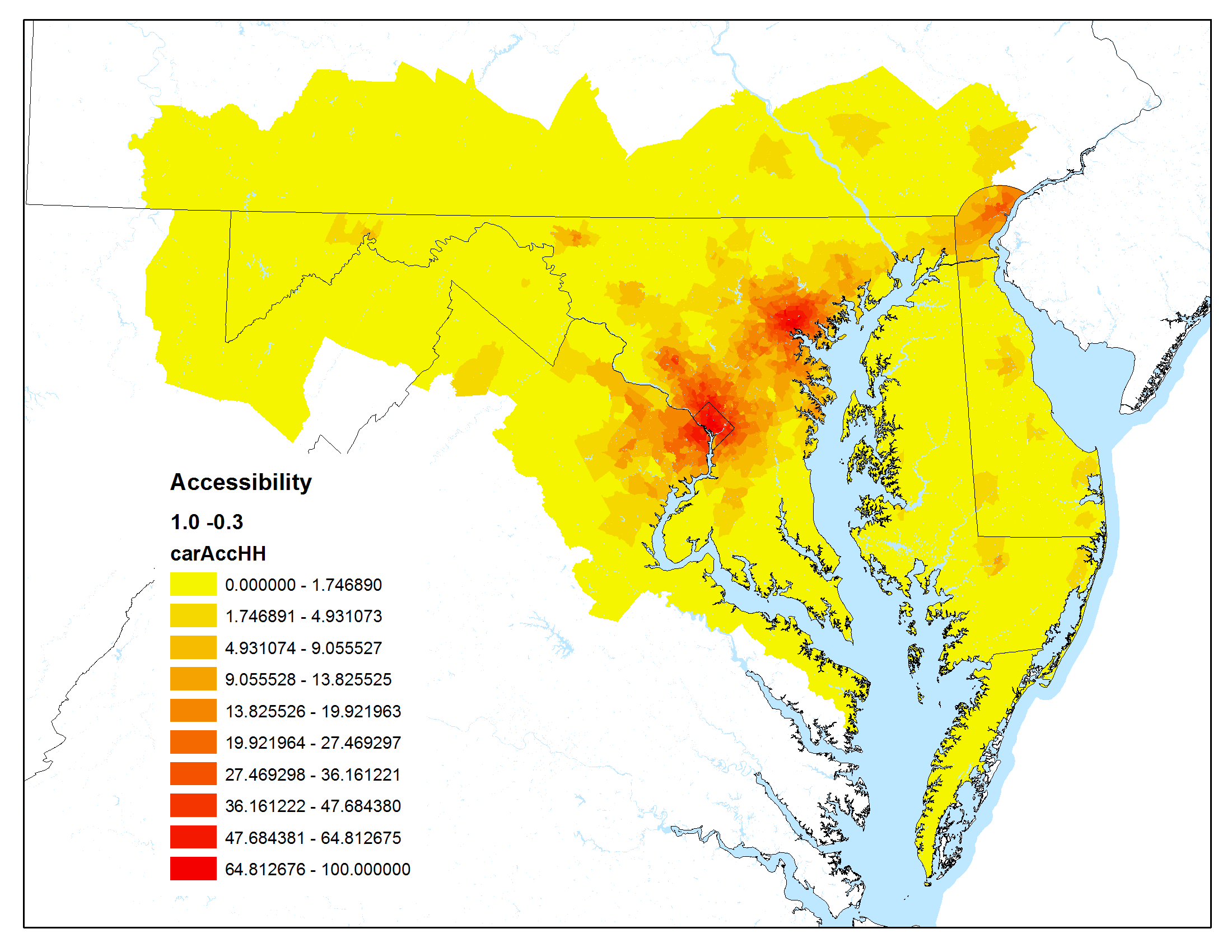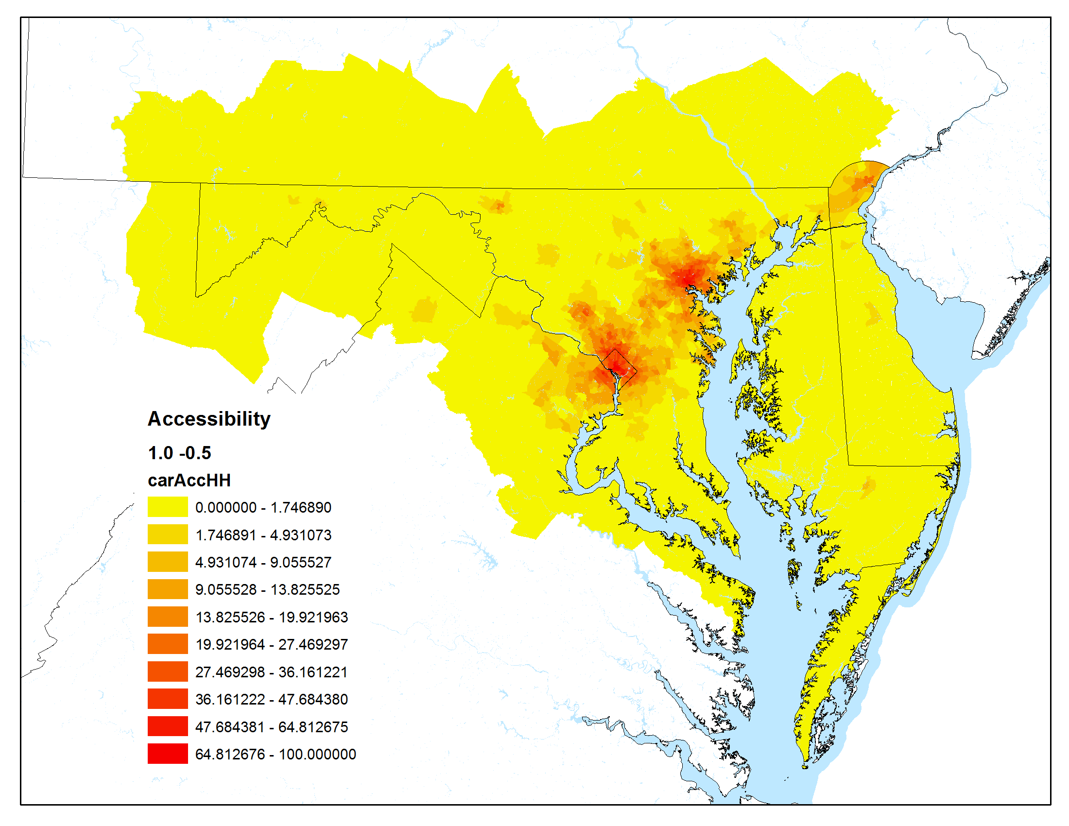 Các bản đồ bên dưới hiển thị bản đồ khả năng tiếp cận được tính toán bằng Mô hình giao thông toàn tiểu bang Maryland.