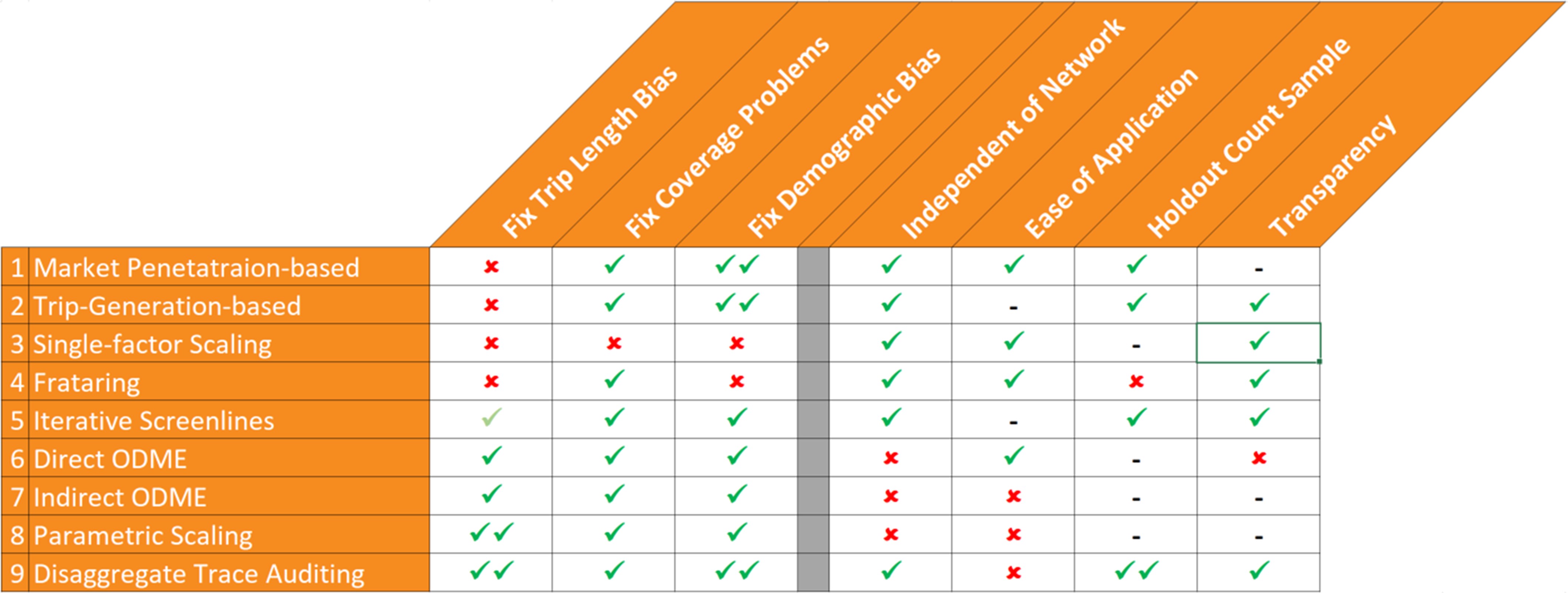 The nine methods now in use for expanding passively collected OD data can be categorized in terms of what control data they expand the passive data to match. There are now three sources of control data for expanding passive data: demographic data generally from the census, traffic counts on the roadway network, and disaggregate trace data from smartphone surveys. Methods based on demographic data such as market penetration-based factors and trip-generation based scaling are important for addressing demographic bias in some datasets, but cannot address trip length bias. Some methods for expanding to traffic counts can correct for trip length bias. Iterative screenline fitting using matrix partitioning does not rely on a network assignment model but is generally limited by several factors and therefore often must be supplemented by other methods. ODME is powerful but must be used with careful constraints, and even then provides little insight into the nature of the expansion. Parametric scaling provides a transparent expansion method, but is difficult to implement. New trace auditing methods using disaggregate smartphone survey data are perhaps the most promising, but require a smartphone survey dataset. While all of the methods have some usefulness, not all methods are equally robust or appropriate for certain datasets or analyses. Multiple complementary expansion methods are therefore often used together as an ensemble.