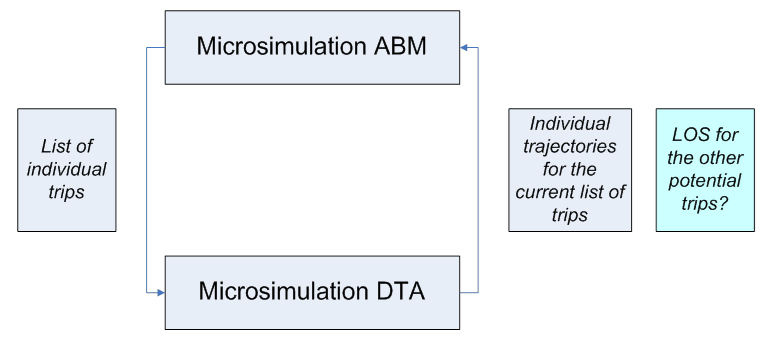 The crux of the problem is, that contrary to the 4-Step-STA integration, the microsimulation DTA can only produce an individual trajectory (path in time and space) for the list of actually simulated trips. It does not automatically produce trajectories for all (potential) trips to other destinations and at other departure times. Thus, it does not provide the necessary level of service feedback to ABM at the disaggregate level for all modeled choices. Any attempt to resolve this issue by “brutal force” would result in an infeasible number of calculations, since all possible trips cannot be processed by DTA at the disaggregate level. In fact, the list of trips for which the individual trajectories can be produced is a very small share of the all possible trips to consider.