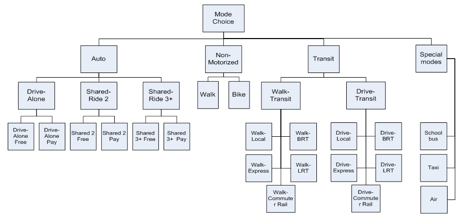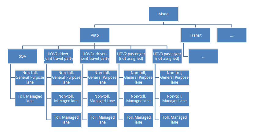 The recent practice with both 4-step models and ABMs was to include route type choice, most frequently as binary or trinary choice between toll, managed-lane, and non-toll general-purpose paths as the lower-level choice in the mode choice structure as shown in the figure below (NCHRP 08-57, SHRP 2 C04). However, some alternative schemas with more reliance on network model were proposed where a segmentation of highway users by VOT instead of the route type choice was suggested. The two methods (route type choice and use segmentation by VOT) can be applied concurrently in the same framework.