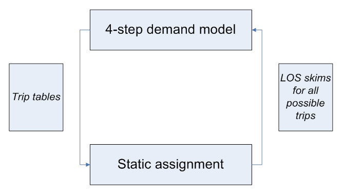 Since the technologies of microsimulation have been brought to a certain level of maturity on both the demand side (ABM) and supply (network) side (DTA), the perspective of ABM-DTA integration has become one of the most promising avenues in transportation modeling. Seemingly, the integration between too models should have been as natural and straightforward, as was the integration concept between a 4-step model and static traffic assignment (STA) shown in Figure 2. That relatively simple integration was based on the fact that both I/O entities involved in the process have the same matrix structure. The 4-step demand model produces trip tables needed for assignment, and the assignment procedures produce full Level-of-Service (LOS) skims in a matrix format that is needed for the 4-step model. Note that the LOS variables are provided for all possible trips (not only for the trips generated by the demand model at the current iteration). In this case we can say that the network model provides a full feedback to the demand model. The theory of global demand-network equilibrium is well developed for this case, and guarantees a unique solution for the problem, as well as a basis for effective practical algorithms.