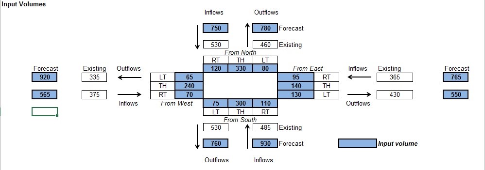 An example of this method is illustrated in the two figures below. The first figure shows the base-year turning movement counts, the calculated incoming and outgoing traffic volumes (by summing the turning movements, labeled “existing”) and the future volumes, both incoming and outgoing. Blue cells are inputs, and white cells are outputs. Notice that traffic is conserved through the intersection, which is a requirement for this technique. The actual calculations are hidden, but are similar to Fratar factoring. The second figure shows the forecasted turning movements (gray cells) and the calculated incoming and outgoing traffic volumes. Also notice that there are tiny discrepancies between the forecasted turning movements and the forecasted volumes owing to convergence error.