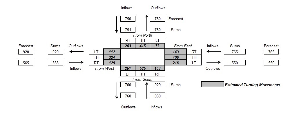 Turning movements are organized into an O-D matrix, where the rows are entering traffic (origins) and the columns are leaving traffic (destinations). Row and column targets are traffic volumes that are derived from earlier steps in the forecasting process. Then the given, historical O-D matrix is iteratively proportioned until there is a reasonable match between row and column totals and their respective targets. Refined turning movements should be reported to the nearest whole vehicle.